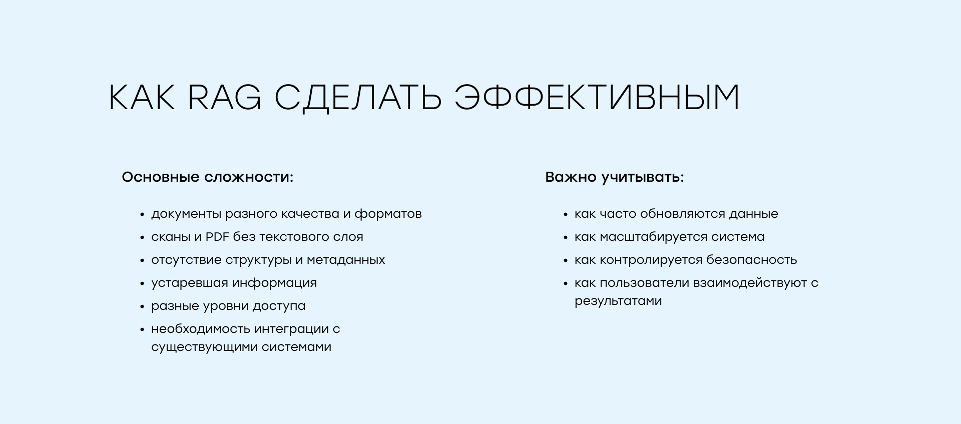 На практике внедрение RAG почти всегда сложнее, чем кажется на старте. Причина в том, что качество системы напрямую зависит не от модели, а от данных и архитектуры.