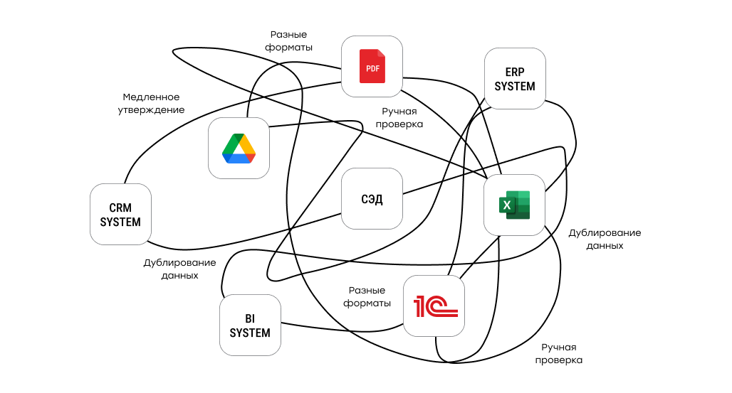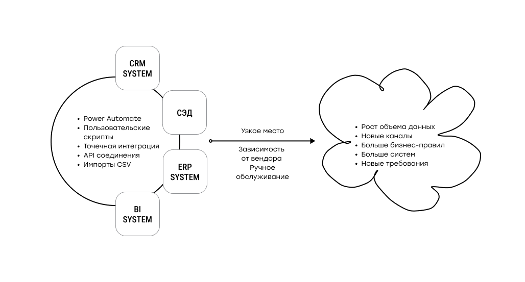 Каждый шаг по отдельности выглядит рационально: внедрили ещё одну CRM, добавили внешний сервис, сделали интеграцию «временно». Но в какой-то момент источников становится столько, что удерживать единые правила работы с данными уже не получается. Одни и те же сущности начинают по-разному называться в разных системах, форматы расходятся, справочники перестают совпадать.