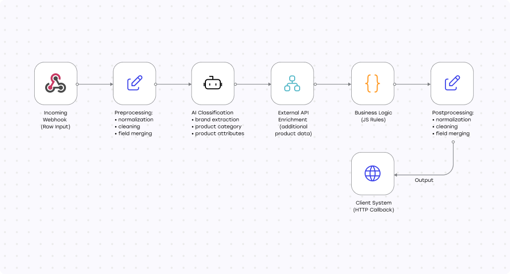 Именно здесь появляется практическая ценность AI и LLM. Они позволяют работать не со строками и правилами, а со смыслом — классифицировать, сопоставлять и нормализовать данные там, где формальные подходы дают сбой. Но сами по себе модели не решают задачу. Без чёткой логики вокруг них AI быстро превращается в источник нестабильных результатов и неконтролируемых затрат.