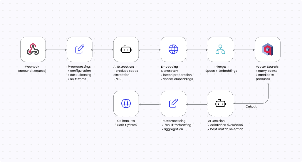 Ключевым изменением стал отказ от последовательных SQL-запросов в пользу векторного поиска. Мы внедрили Qdrant и перевели сопоставление товаров в семантическую плоскость. Вместо точных совпадений по строкам система начала подбирать релевантные варианты по смыслу и сравнивать их пакетно.