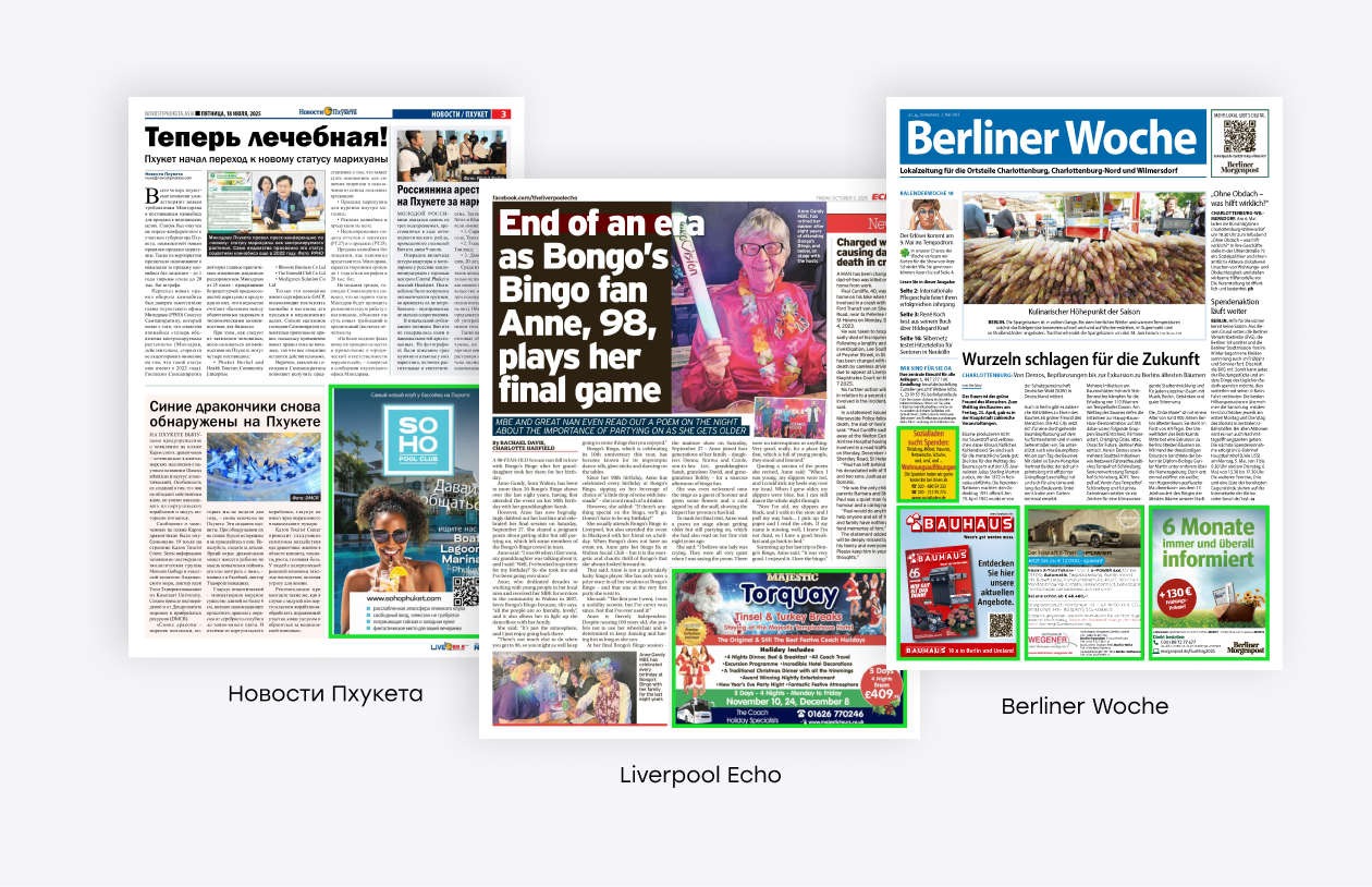 Третий подход предполагает применение предварительно обученной модели, способной сразу выделять на газетной странице целые статьи и рекламные блоки в единые объекты. Но это требует наличия большого размеченного датасета, на котором такую модель можно обучить.
