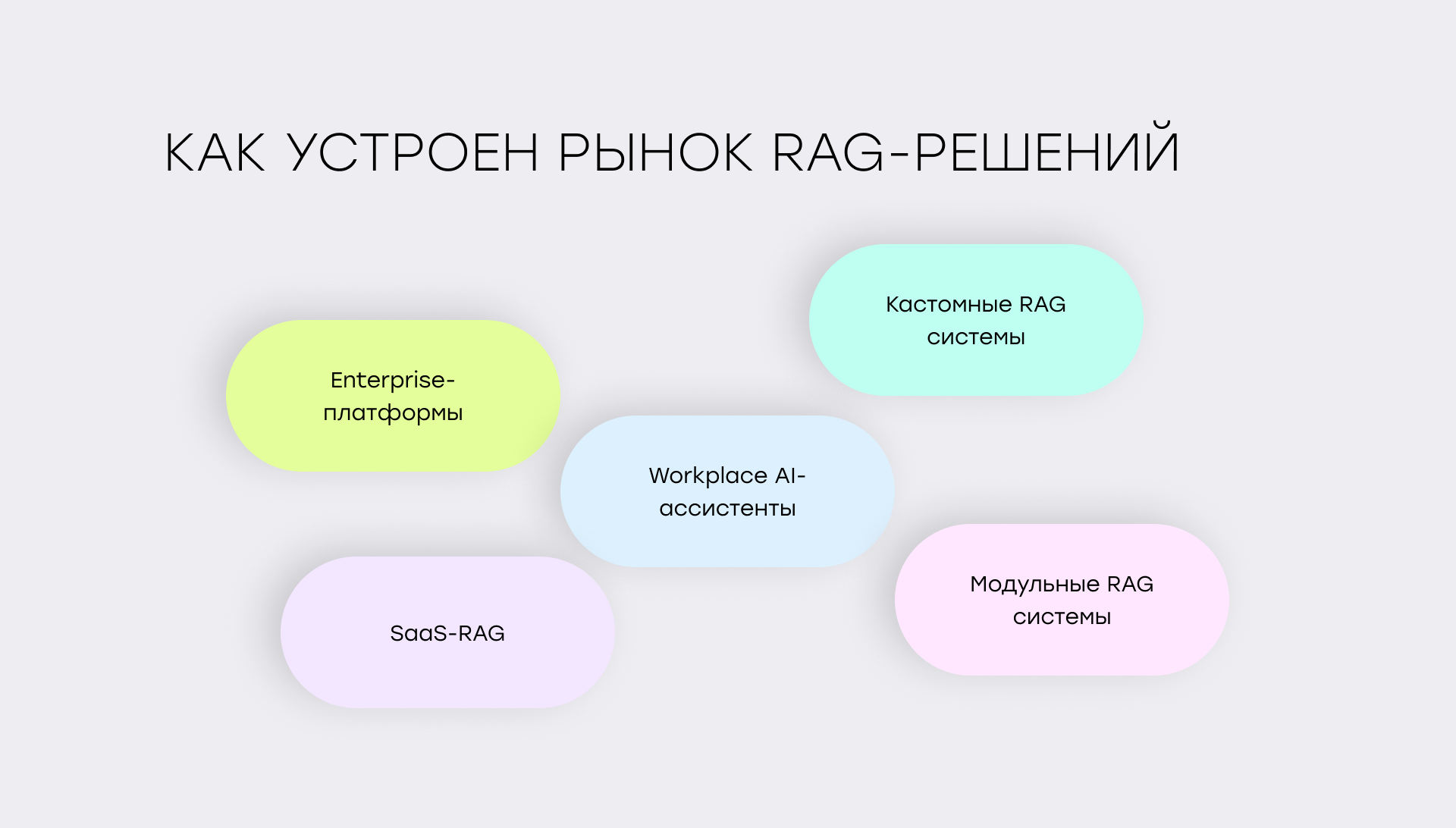 Российский рынок находится на более ранней стадии зрелости и имеет другую структуру. Здесь меньше готовых SaaS-продуктов для корпоративного RAG и больше проектных внедрений.