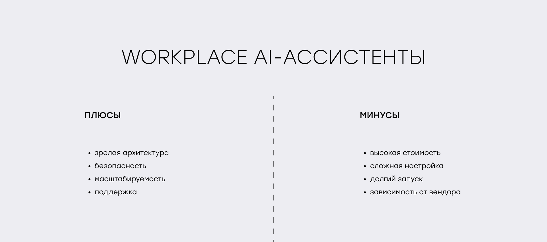 С другой – SaaS-инструменты для mid-market и workplace-ассистенты (ChatGPT Business, Guru, StackAI и др.), которые позволяют быстро запустить пилот, но ограничены по гибкости, безопасности и работе со сложными документами.