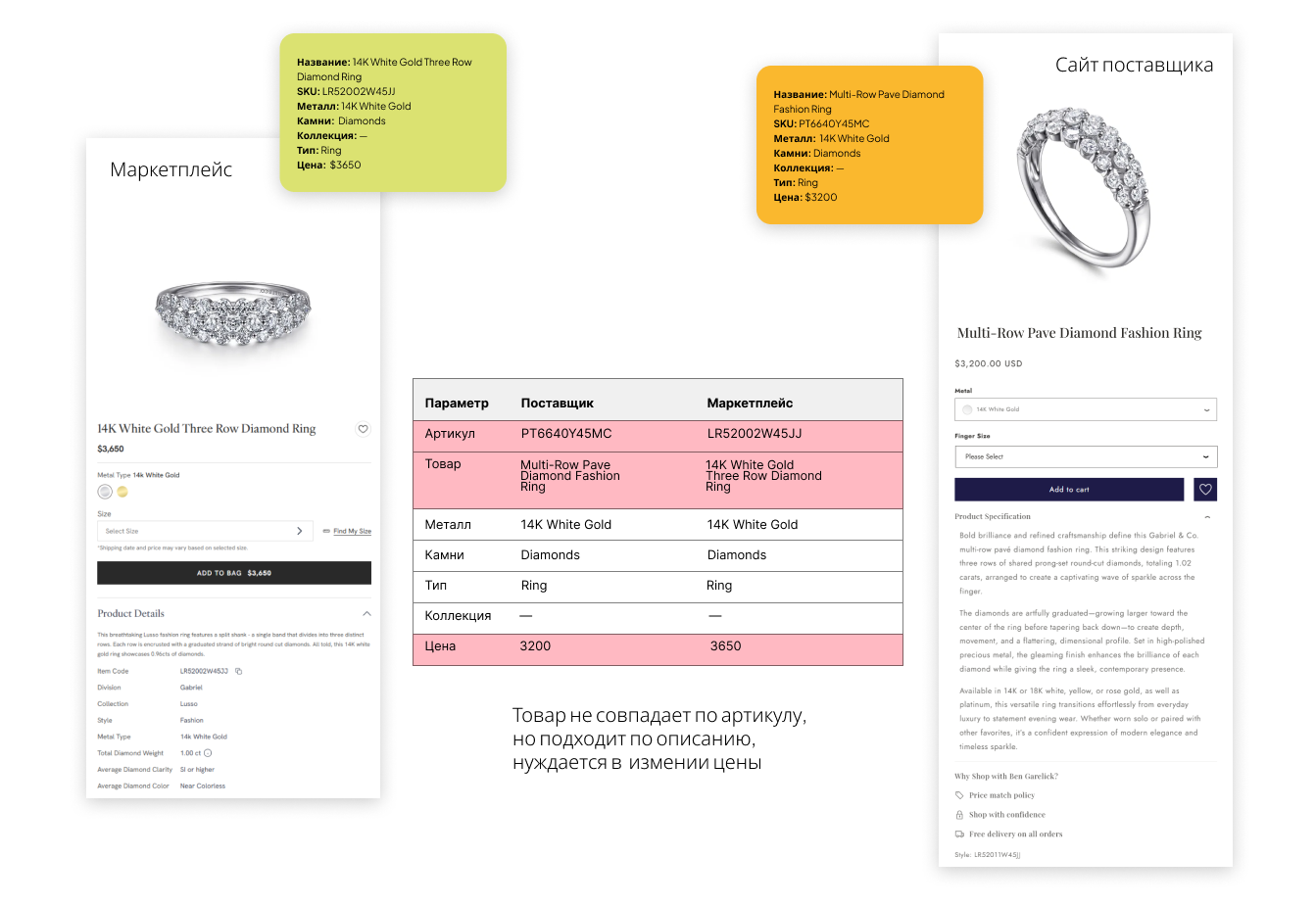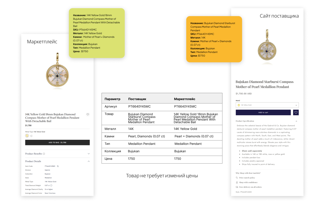 Клиент — премиальный ювелирный бренд с собственным производством, представленный на нескольких онлайн-площадках и у партнерских ритейлеров. В ассортименте клиента тысячи изделий: кольца, серьги, подвески с большим количеством вариаций по металлам, цветам золота и размерам.