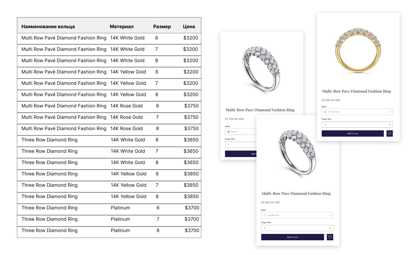 Отдельной задачей была обработка вариаций. Один и тот же продукт может иметь несколько комбинаций по цвету и металлу, а также по размерам изделия.